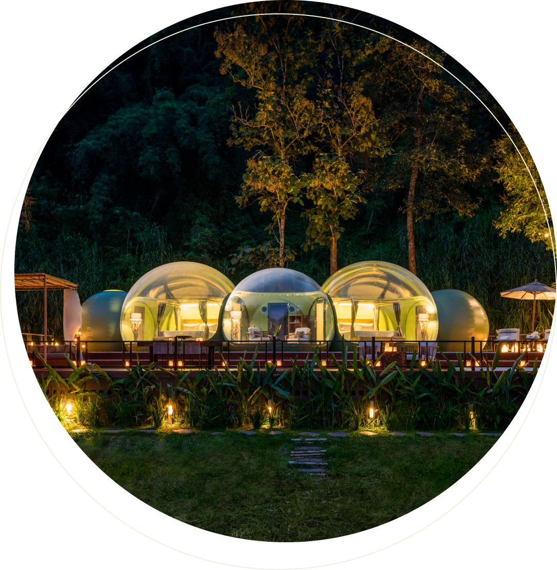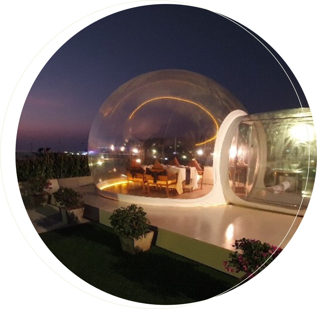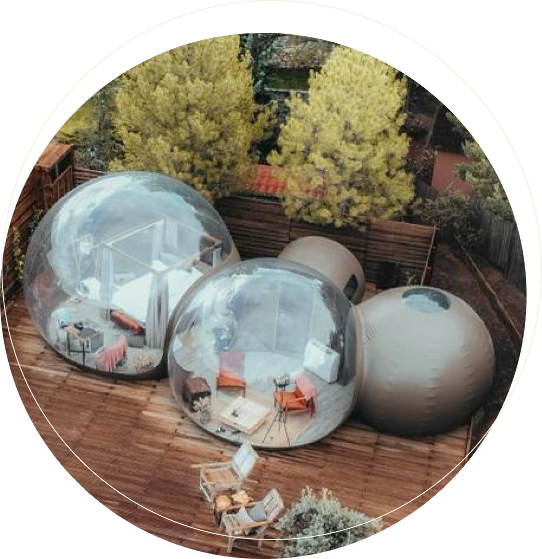 Si hubiéramos limitado la experiencia SKB solo a las parejas nos habríamos equivocado. Nuestra Skybubble más exótica cuenta con la posibilidad de alojar hasta 4 personas, con dos baños independientes, para que familia y amigos puedan disfrutar en un mismo espacio del universo de vivencias que te ofrece nuestro concepto. Una experiencia potente y distinta para grupos y familias que desean salir de lo convencional.